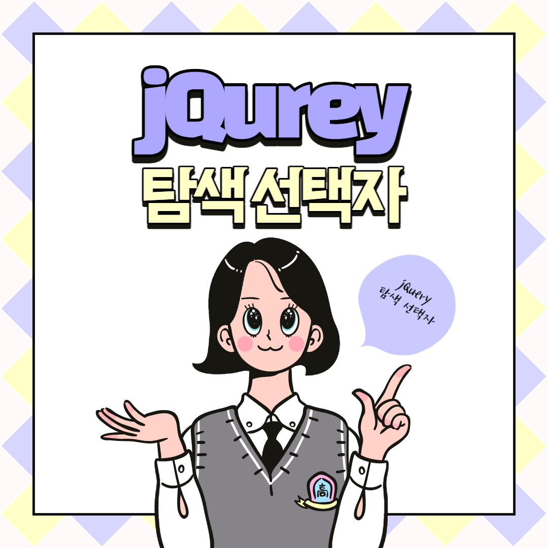 | is() | 선택한 요소를 판별해 주는 선택자로 보통 if 문의 조건식에 사용됩니다. if("div").children().is("p"){ console.log("p요소가 맞습니다."); } |